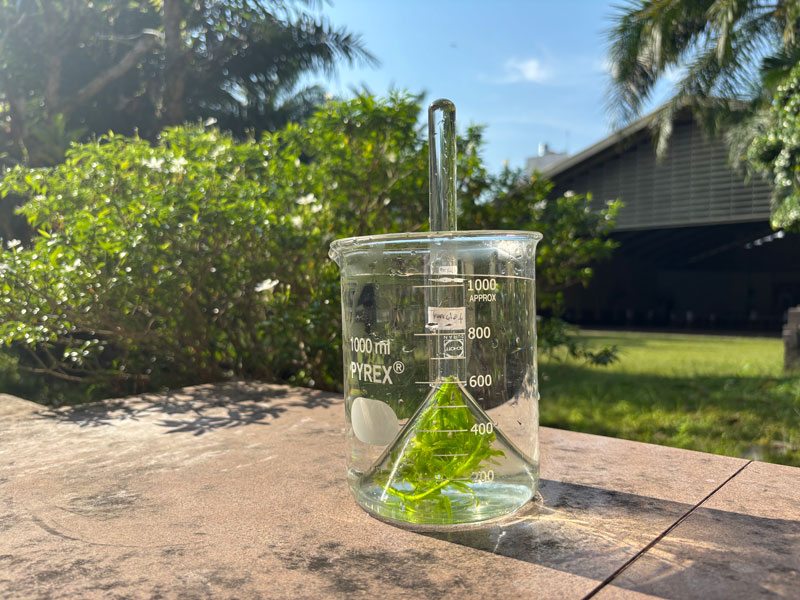 Terkait percobaan Ingenhousz, setiap kelompok akan diberi dua gelas beker berukuran 1000 mL, 2 tabung reaksi, dan dua corong. Setelah kedua corong terisi hydrilla dengan berat yang sama, corong dimasukkan secara terbalik ke dalam gelas beker. Isi dengan air sampai gelas beker penuh dan tutup dengan tabung reaksi yang juga terisi penuh dengan air tanpa ada gelembung sedikit pun. Taruh satu gelas beker di dalam ruangan dan sisanya di luar ruangan, tunggu sampai ± 30 menit.