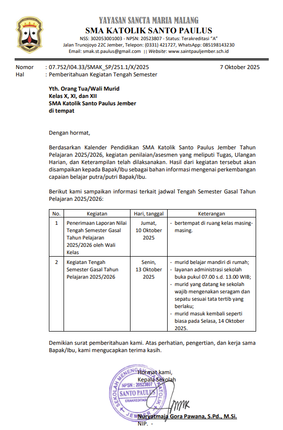 Berdasarkan Kalender Pendidikan SMA Katolik Santo Paulus Jember Tahun Pelajaran 2025/2026, kegiatan penilaian/asesmen yang meliputi Tugas, Ulangan Harian, dan Keterampilan telah dilaksanakan. Hasil dari kegiatan tersebut akan disampaikan kepada Bapak/Ibu sebagai bahan informasi mengenai perkembangan capaian belajar putra/putri Bapak/Ibu.