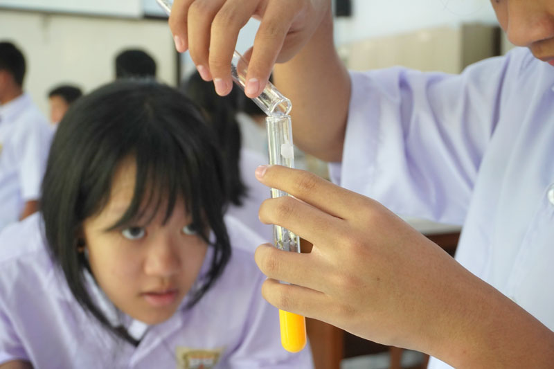 Sebelum mulai bereksperimen, para murid diperkenalkan dengan berbagai alat laboratorium seperti tabung reaksi, gelas beker, pipet tetes, corong, dan pembakar spiritus. Setiap alat memiliki fungsi masing-masing. Selain itu, para siswa diajak untuk belajar cara menggunakannya dengan benar agar aman selama proses praktikum. Pada praktikum pertama, murid mencampurkan dua jenis larutan yang sudah ditentukan untuk diamati perubahan yang terjadi. Dari warna hingga endapan, semua menunjukkan tanda-tanda adanya reaksi kimia.